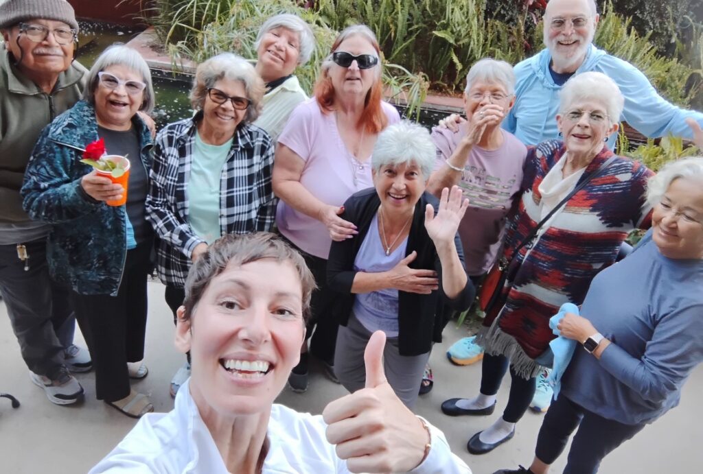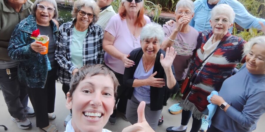 A community laughing together during dance fitness.